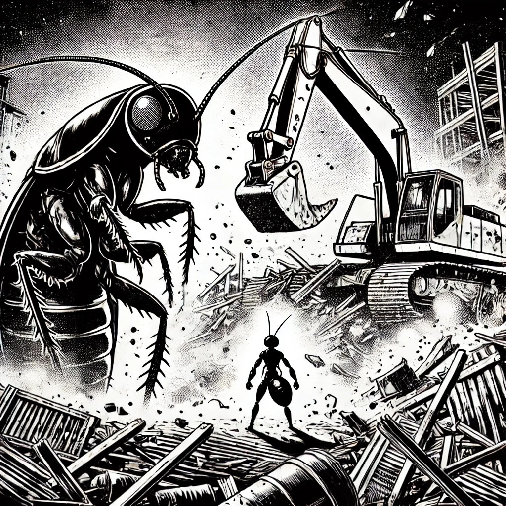 “Saldırın!” emrini verdikten sonra bütün askerlerle birlikte kendisi de koşmaya başladı. Tahmin ettiği gibi hamam böceklerini gafil avlamışlardı, zafer sarhoşluğu içerisinde hayatta kalan yaralı karıncalara işkence etmekle meşgullerdi. Albay Aru o kadar hızlandı, o kadar hızlandı ki ordunun en arkasından bir anda en önüne gelmişti, son sürat koşuyordu ve ilk düşmanla çarpışan da o oldu. Bir hamam böceğinin altından girip onu omuzlarının üzerinden geriye doğru takla attırarak ters çevirdi, diğer karıncalar aniden ve vahşice ters dönmüş hamam böceğinin zayıf yeri olan eklemlerinin çıkış noktalarını parçalamaya koyuldular. Savaş sert ve çetin başladı. Hamam böcekleri neye uğradıklarını şaşırdılar, yaralı olan karıncalar arkadaşlarını görünce bir anda cana geldiler ve kalkıp yaralı halde savaşmaya başladılar. Her şey Albay Aru’nun istediği gibi ilerlerken aniden büyük bir gürültü patladı ve ev sarsılmaya başladı. İlk başta iki taraf da aldırmadı ve savaşmaya devam etti. Gürültü kendini tekrarladı ve sarsıntı bu sefer çok daha şiddetli bir şekilde geldi. Bu sefer savaş durmuştu, neye uğradığını şaşıran hayvanlar şaşkın bir şekilde etraflarına bakınmaya başladılar. İki taraf birden tarif edilemeyecek bir paniğe büründü. Bir gürültü daha koptu ve bu sefer şiddetli sarsıntının ardından büyük bir parça duvar savaş alanının bir bölümüne düştü. Hamam böceklerinin ve karıncaların yarısı duvarın altında kalarak o an öldüler. Evin içine aniden dolan güneş yüzünden Albay Aru tam olarak ne olduğunu ilk an göremedi. Duvarlar hızla yıkılmaya devam ediyordu ve tahammül edilemeyecek bir gürültü vardı. Albay Aru o an ne olduğunu anladı; insan icadı dev tekerlekli bir makine duvarları yıkıyordu. Dev canavar bir darbe daha indirdi ve büyük bir yıkıntı Albay Aru’nun olduğu bölüme indi. Bütün vücudu molozların altında kalan Albay son nefesini verdiğinin farkına vardı. Kraliçe’yi düşündü, tek zaferini kazandırmak üzereydi fakat insanoğlu izin vermemişti. Bilge karıncanın sözünü hatırlayıp diğer bütün hayvanlar gibi yıkılan evin altında kalıp öldü. Son savaşını kaybetmişti.
